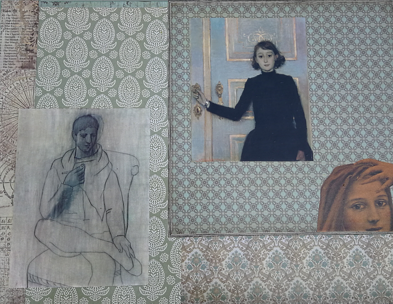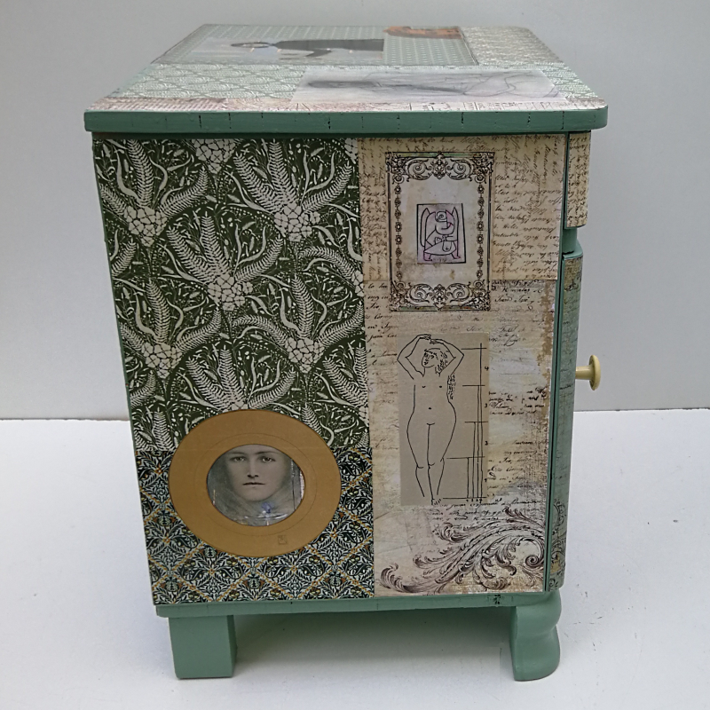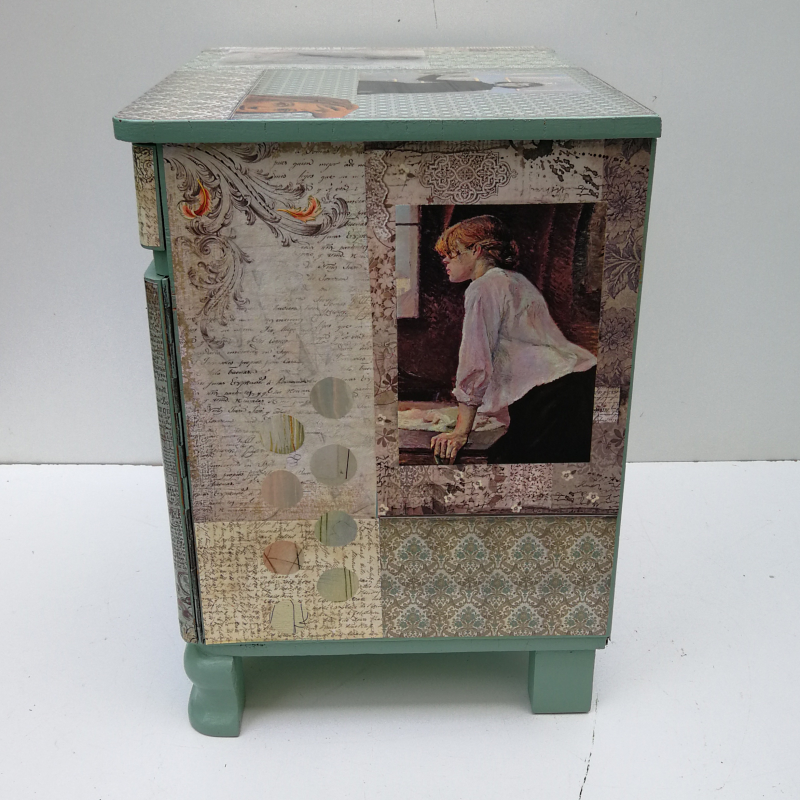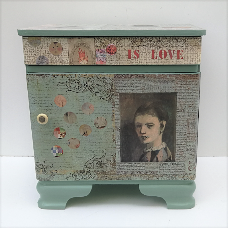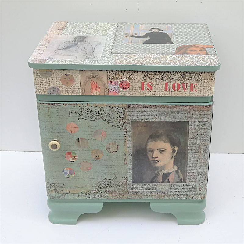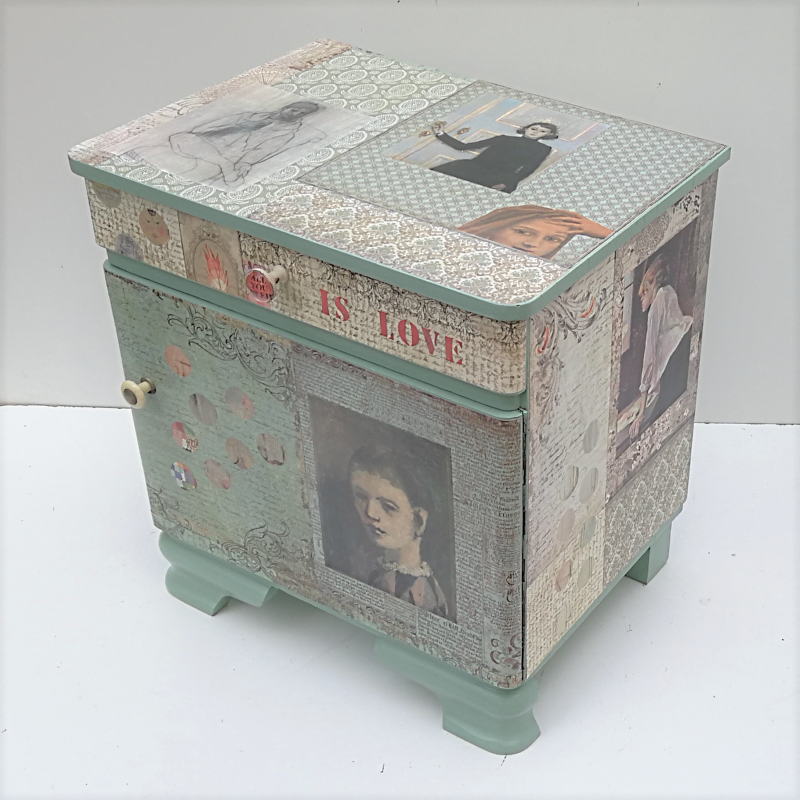 UNIKAT! Nachtschrank mit geschwungenen Beinen, einer Tür und einer Schublade. Der Möbelgriff an der Schublade trägt den Schriftzug "ALL YOU NEED", "IS LOVE" wird auf der Schubladengestaltung hinzugefügt. Der Griff der Tür ist aus Metall und Bakalit. Porträts u. a. von Picasso und Max Ernst sind auf einem Untergrund aus Schriftpapieren, grünen Musterpapieren und Punkten, geschnitten aus Kunstdrucken, angeordnet. VERSAND MÖGLICH.