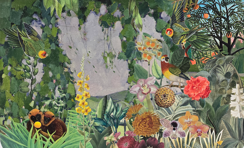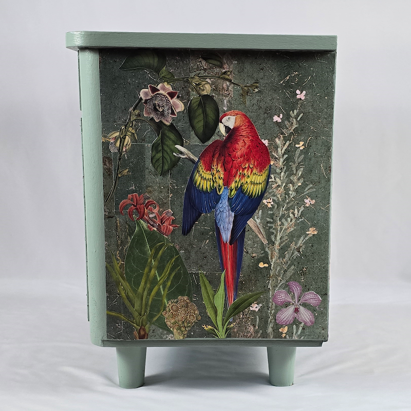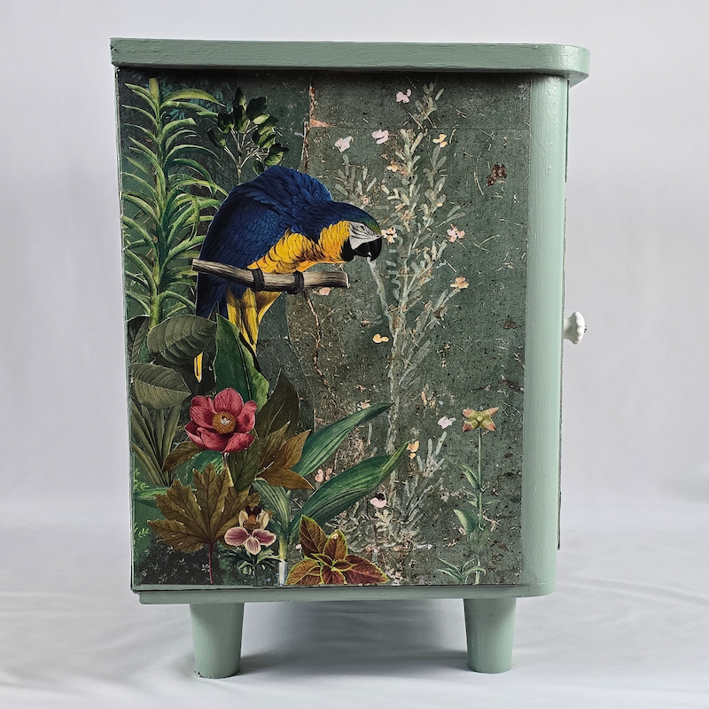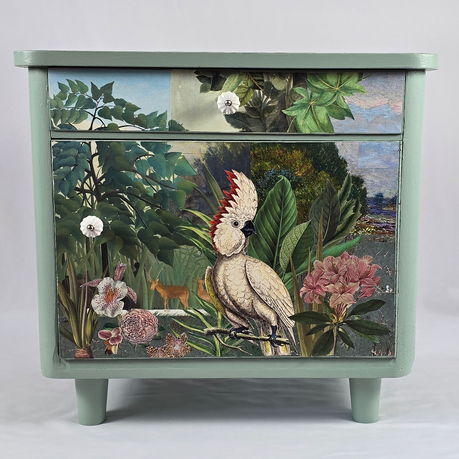 UNIKAT! Kompakte Kommode mit einer Schublade, einer Tür und weißen Porzellangriffen. Die Flächen sind gestaltet mit einer aufwändigen Collage aus Dschungelbildern, zahlreichen Pflanzenabbildungen, Papageien und einem weißen Kakadu auf der Tür. VERSAND MÖGLICH.