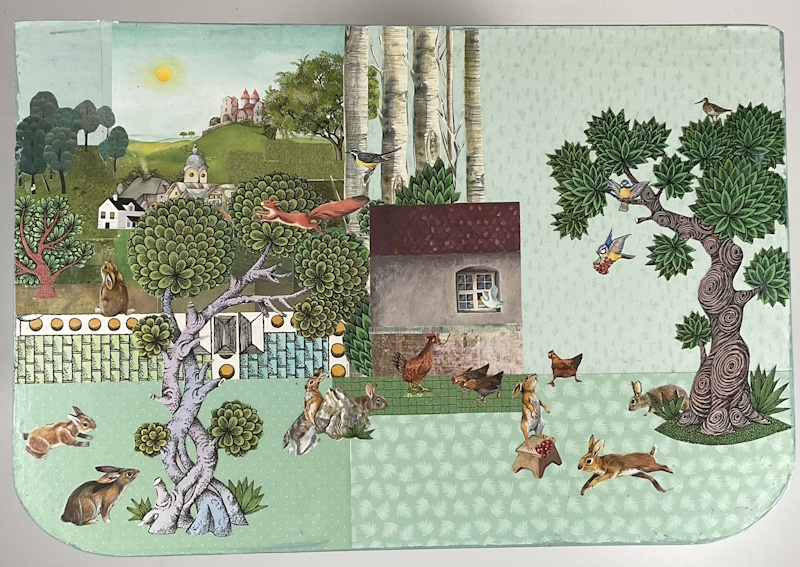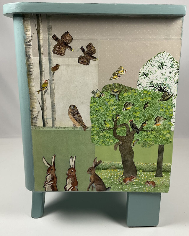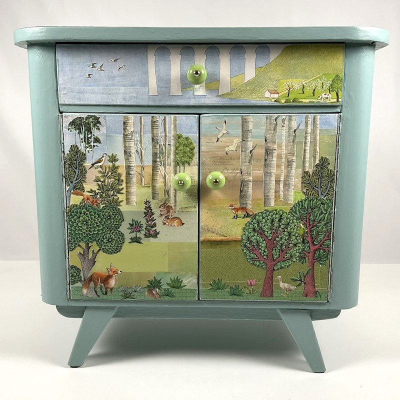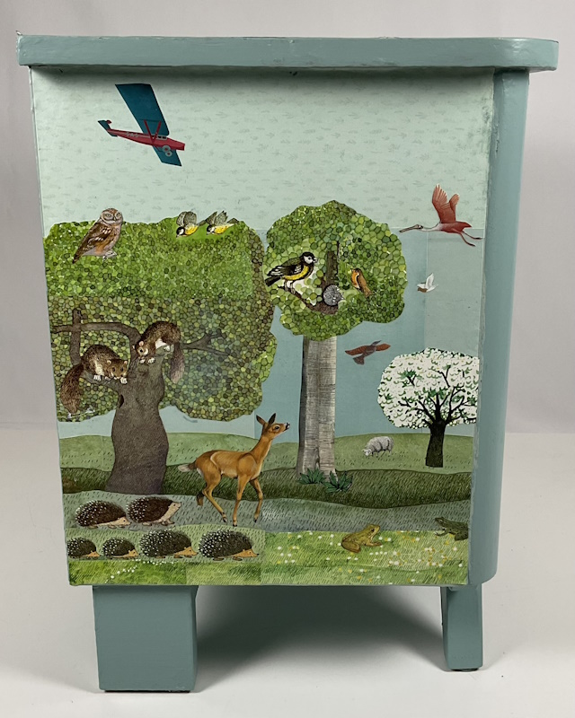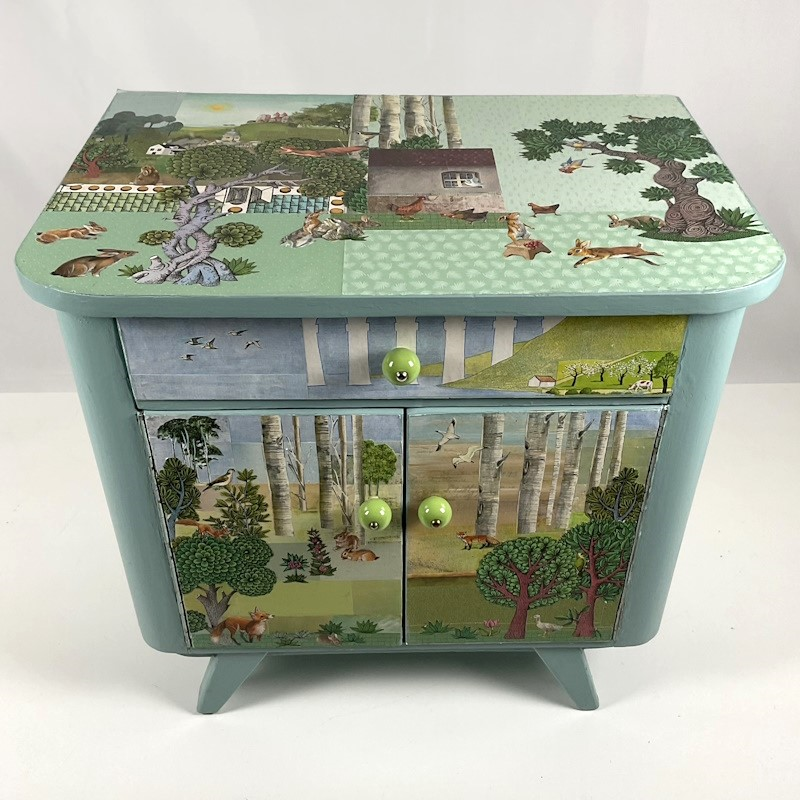 UNIKAT! Niedrige Kommode mit zwei Türen, einer Schublade und Porzellangriffen. Alle Flächen sind gestaltet als Landschaften mit Bäumen und Häusern, in denen eine muntere Hasenfamilie herumtobt. Ihre Freunde sind die Vögel, Siebenschläfer, Eichhörnchen, Igel, Frösche und ein Reh auf rechten Seite. Die beiden Füchse auf der Deckplatte zählen wohl nicht zum Freundeskreis. Viele Bildelemente stammen aus Kinderbüchern der 60er Jahre. Die kleine Kommode eignet sich für ein Kinderzimmer. VERSAND MÖGLICH.