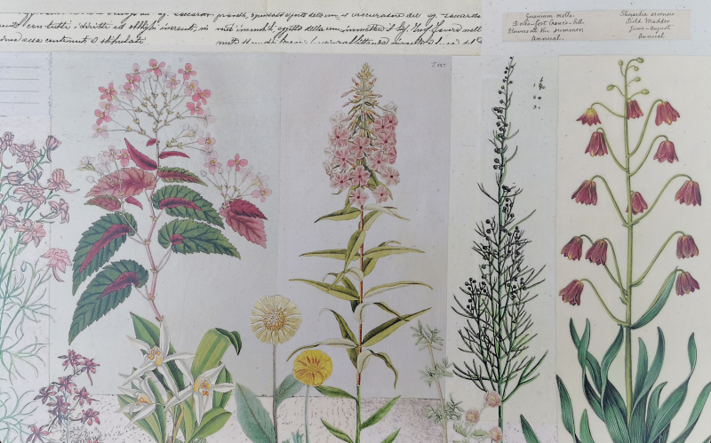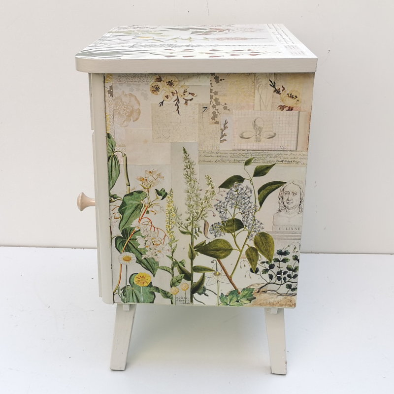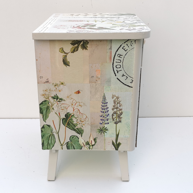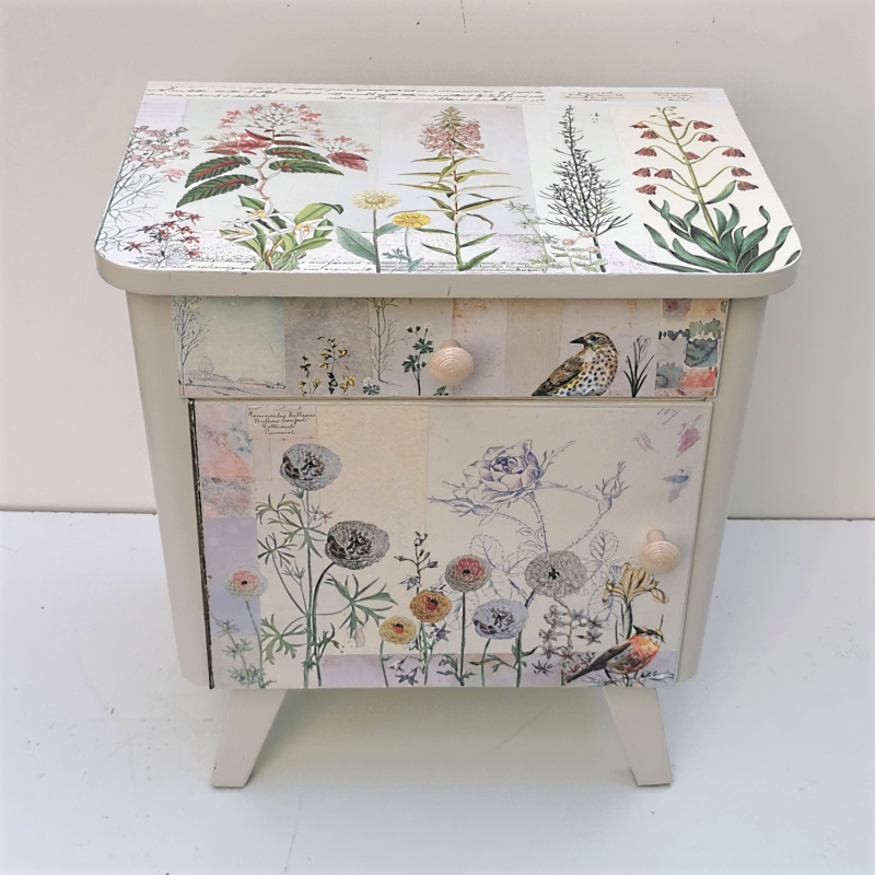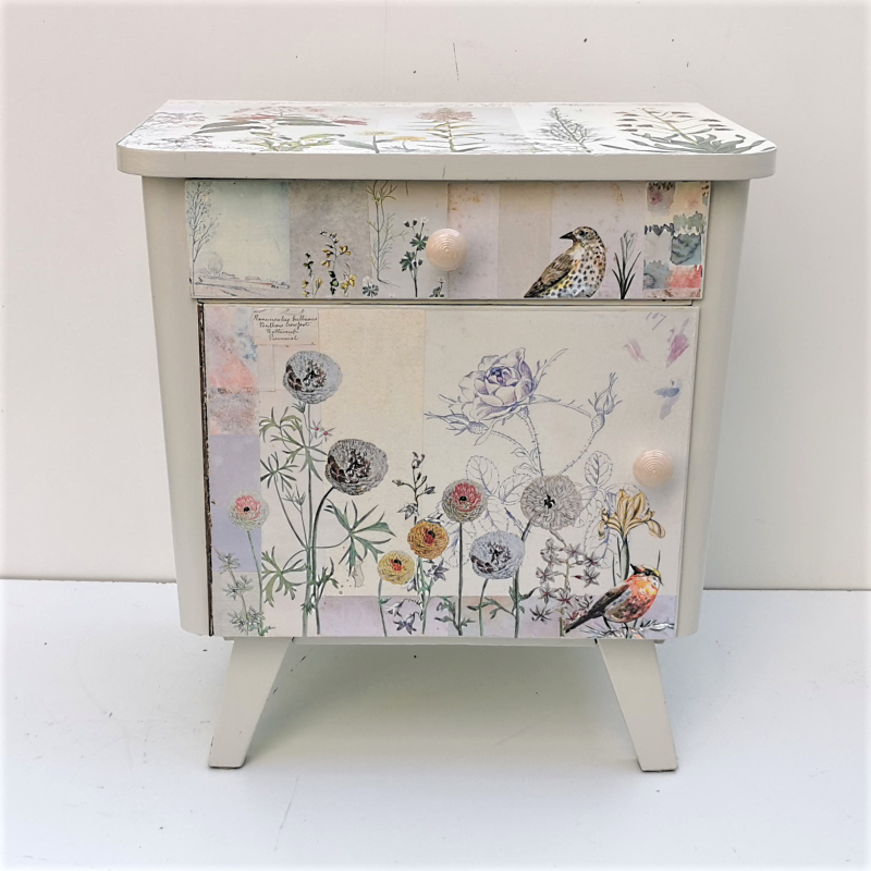 UNIKAT! Niedrige Kommode mit ausgestellten Beinen, einer Schublade, einer Tür und Porzellangriffen. Auf zartem hellen Grund wachsen Blumenbeete in Pastellfarben. VERSAND MÖGLICH.
