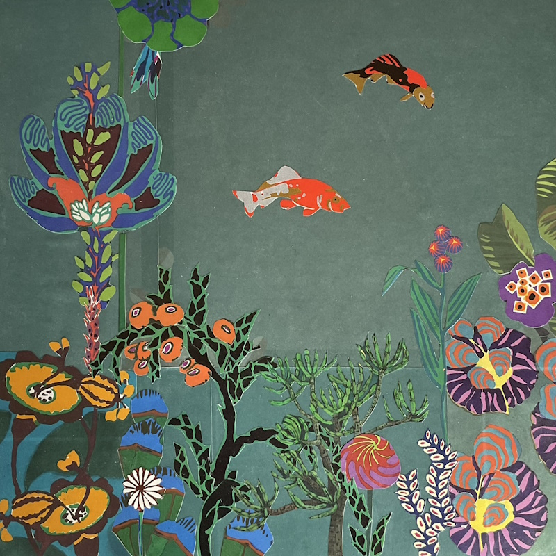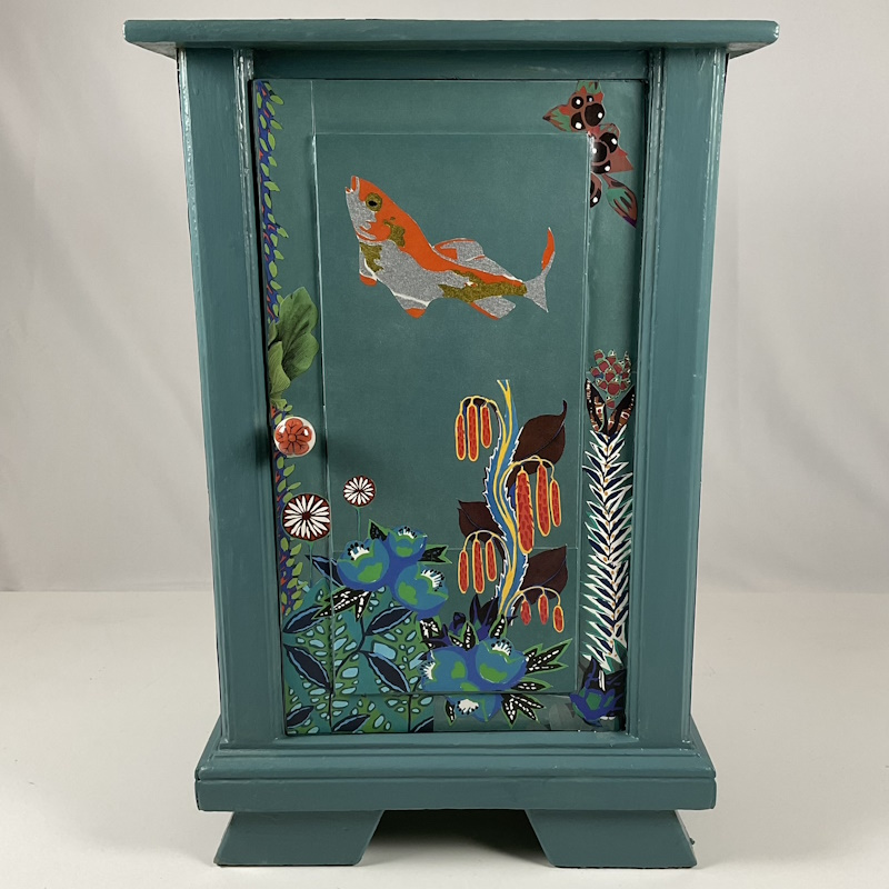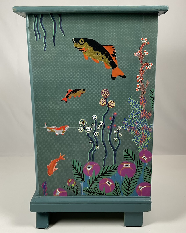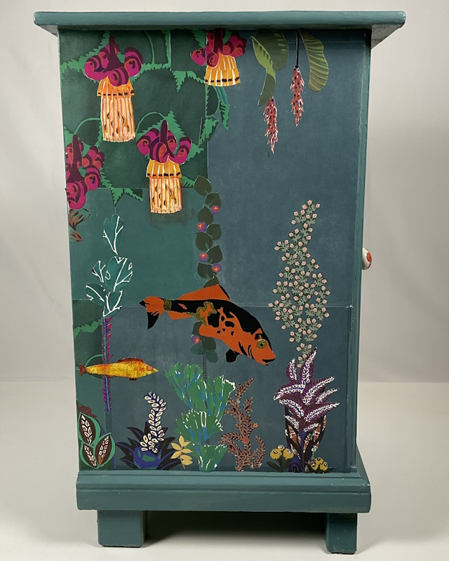 UNIKAT! Hohe Kommode mit einer Schublade, zwei offenen Fächern und einem Porzellanknopf. Alle Außenflächen sind gestaltet mit Fischen und Wasserpflanzen. Die Elemente stammen aus Art Deco Entwürfen und leuchten auf einem einheitlich petrolfarbenen Hintergrund. VERSAND MÖGLICH.
