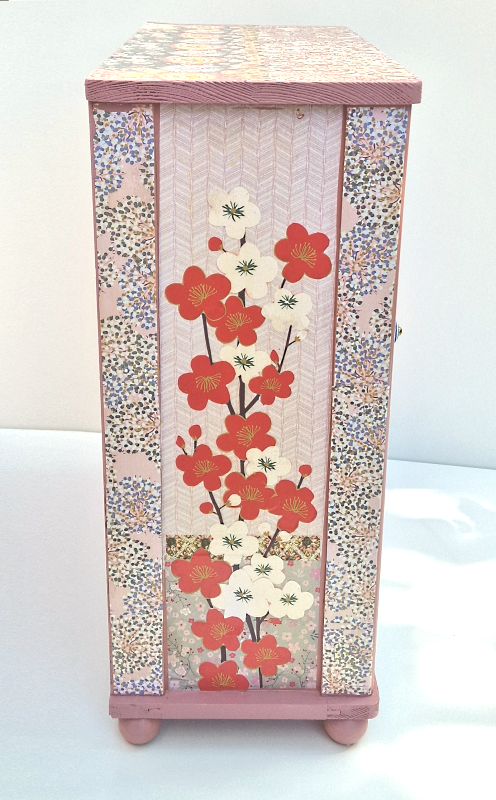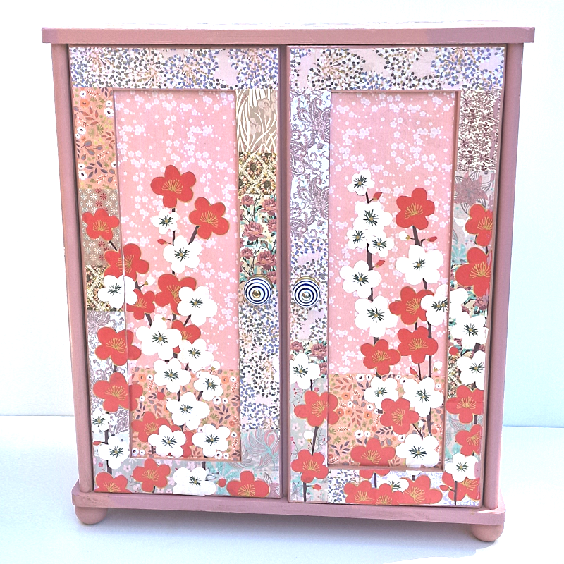 UNIKAT! Großer Puppenschrank mit Porzellangriffen. Innen sind drei Regalbretter und eine Kleiderstange angebracht. Das Puppenmöbel ist in Rosatönen gestaltet. Auf diesem Hintergrund blühen üppig Kirschblüten in Weiß und Rot und schweben Schmetterlinge. VERSAND MÖGLICH.