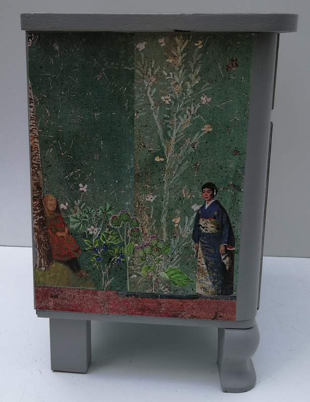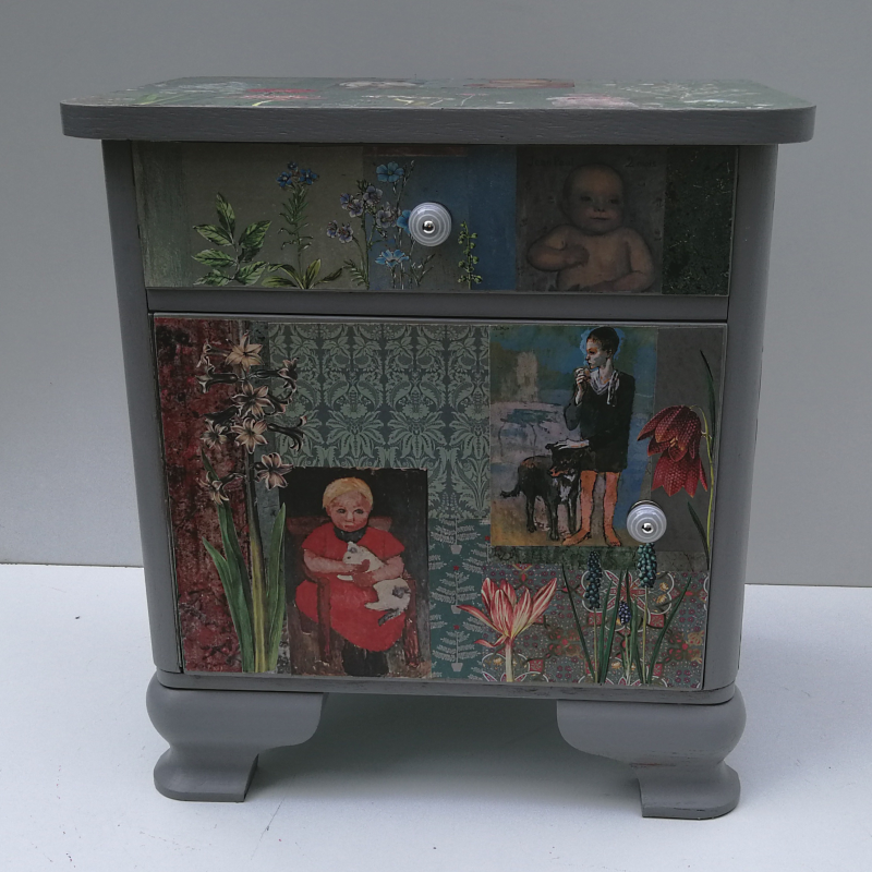 UNIKAT! Niedrige Kommode mit einer Schublade, einer Tür und Keramikknöpfen. Die Flächen sind gestaltet mit Ausschnitten aus Fresken und Kunstdrucken mit Kinderbildnissen. VERSAND MÖGLICH.