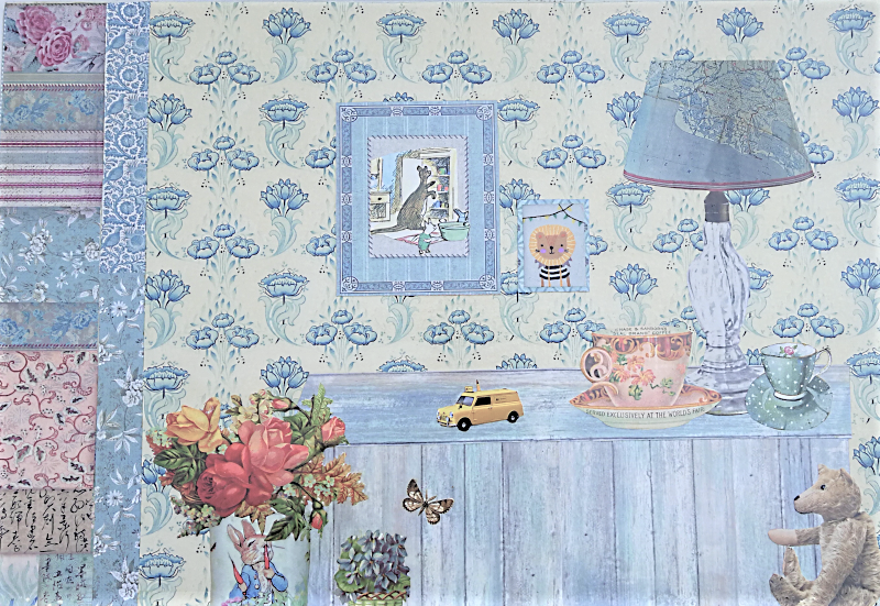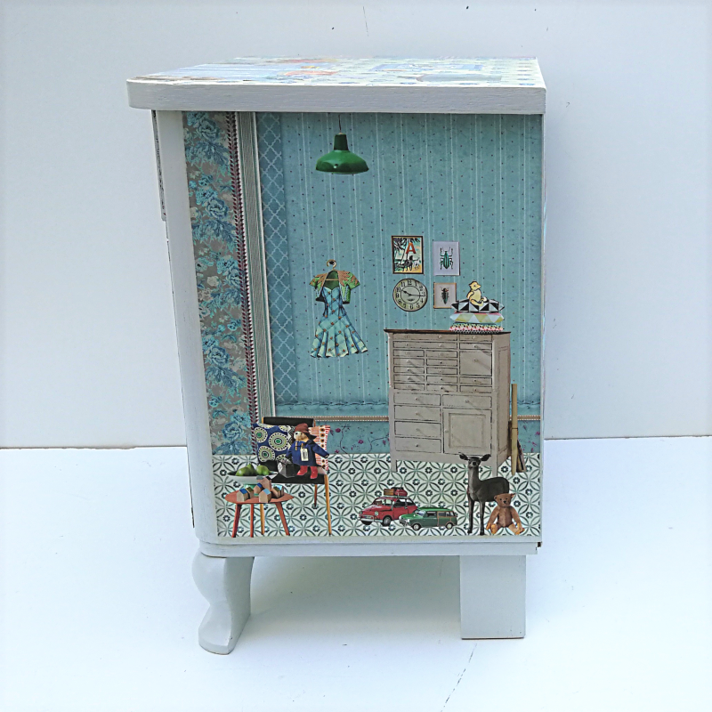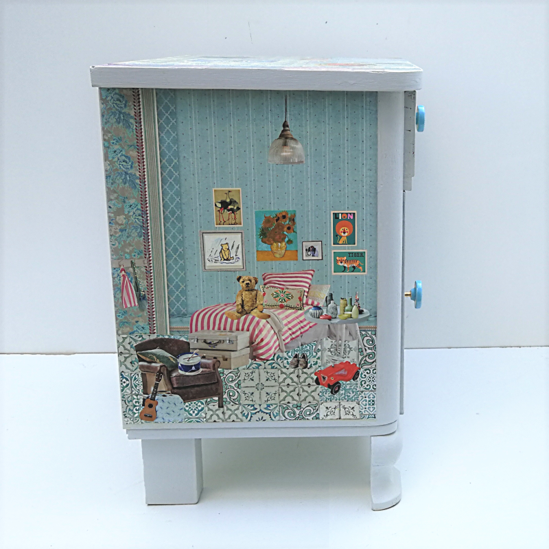 UNIKAT! Kleine Kommode mit geschwungenen Beinen, einer Tür, einer Schublade und Porzellangriffen. Unter Verwendung hochwertiger Musterpapiere entstand eine Kinderkommode mit Einblicken in Kinderzimmer: Spielsachen, Lieblingsecken, ein Koffen und Bilderwände werden von Lampen beleuchtet. VERSAND MÖGLICH.