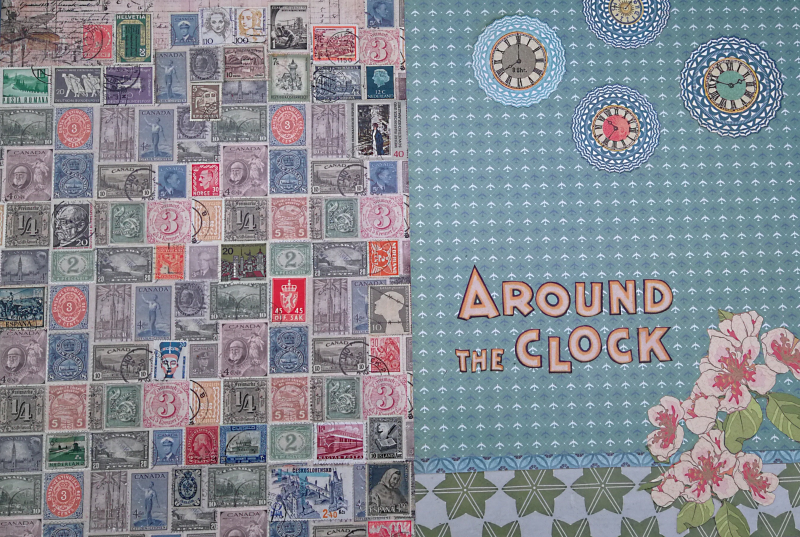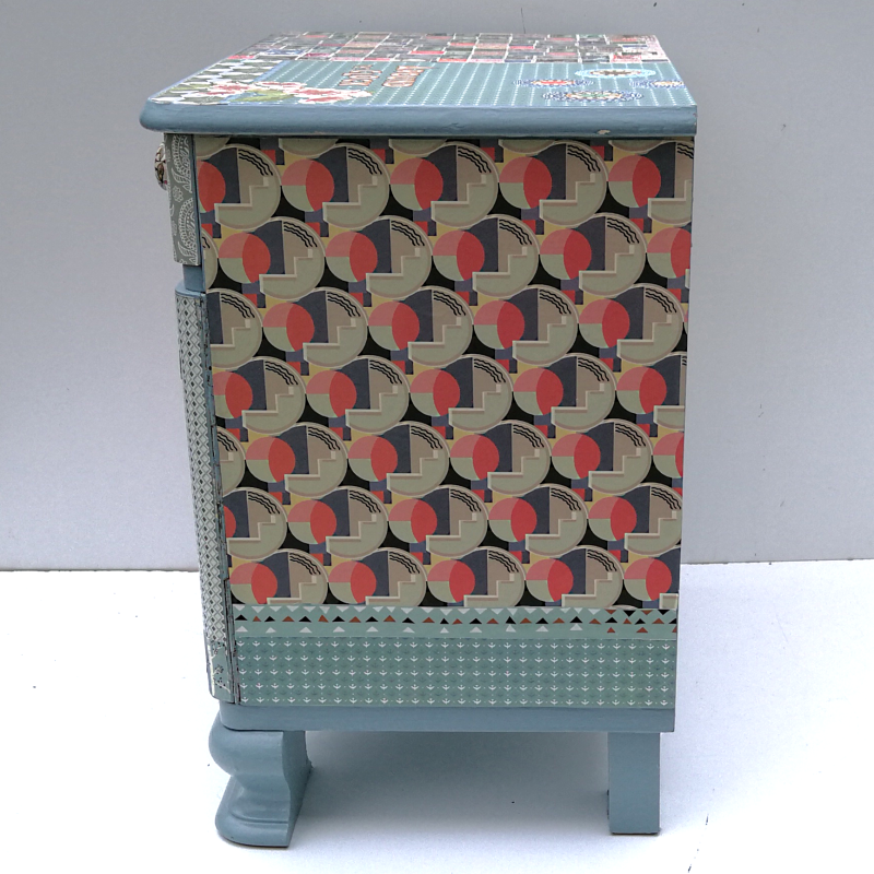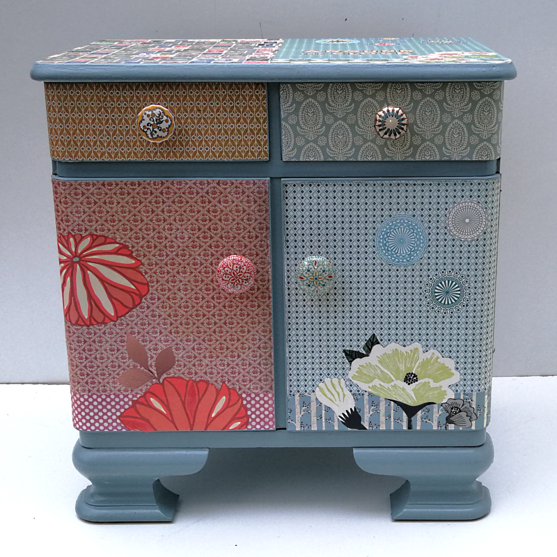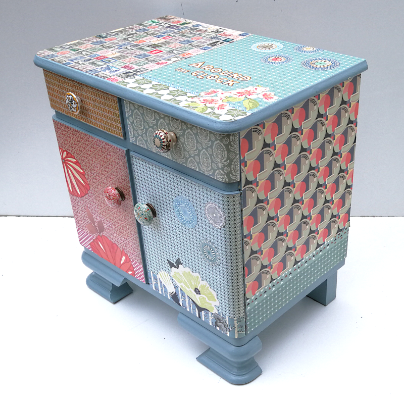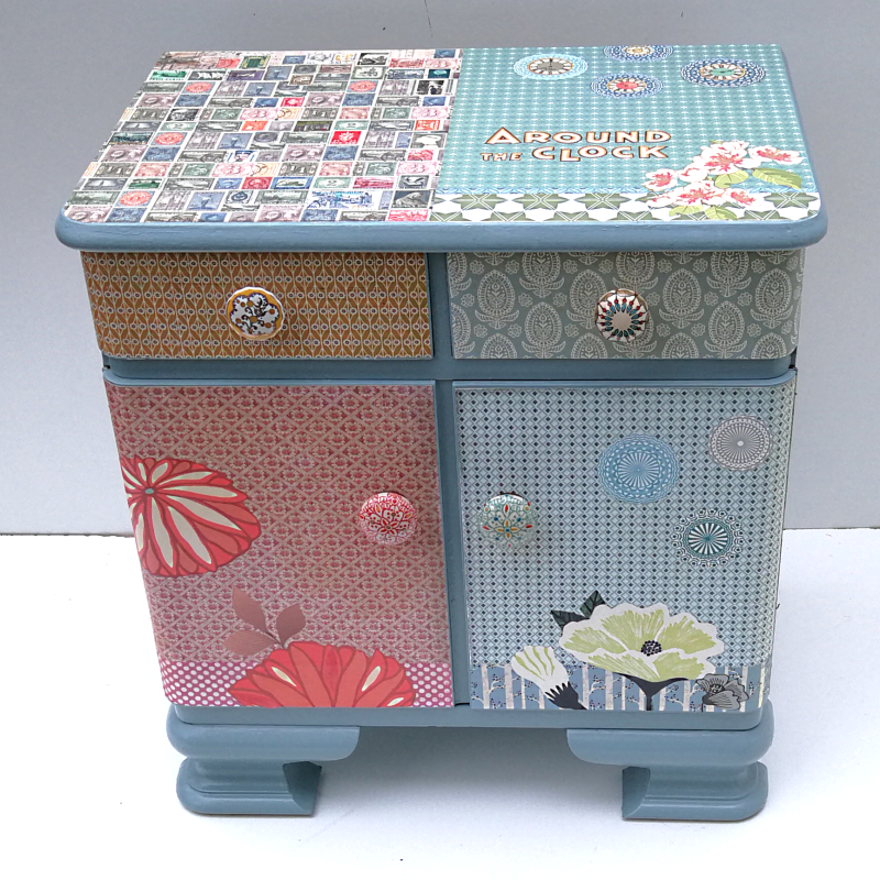 UNIKAT! Massive, zweitürige Kommode mit zwei Schubladen und vier unterschiedlichen Porzellanknöpfen. Diese mit Musterpapieren gestaltete Kommode fällt durch die zweifarbige Gestaltung bei den Schubladen und Türen auf - rechts in Grün/Grau und links in Rot/Gelb. Beide Farbtöne sind in der Seitengestaltung mit einem Art Deco Papier enthalten. Auf der Deckplatte wurde auf der rechten Seite ein Papier mit Briefmarken (vervollständigt durch echte Briefmarken) und auf der linken Seite ein Musterpapier verarbeitet. Rechts sind Uhrblätter, Blüten und der Schriftzug "Around the Clock" angebracht. VERSAND MÖGLICH, Kommode ist 20 kg schwer!