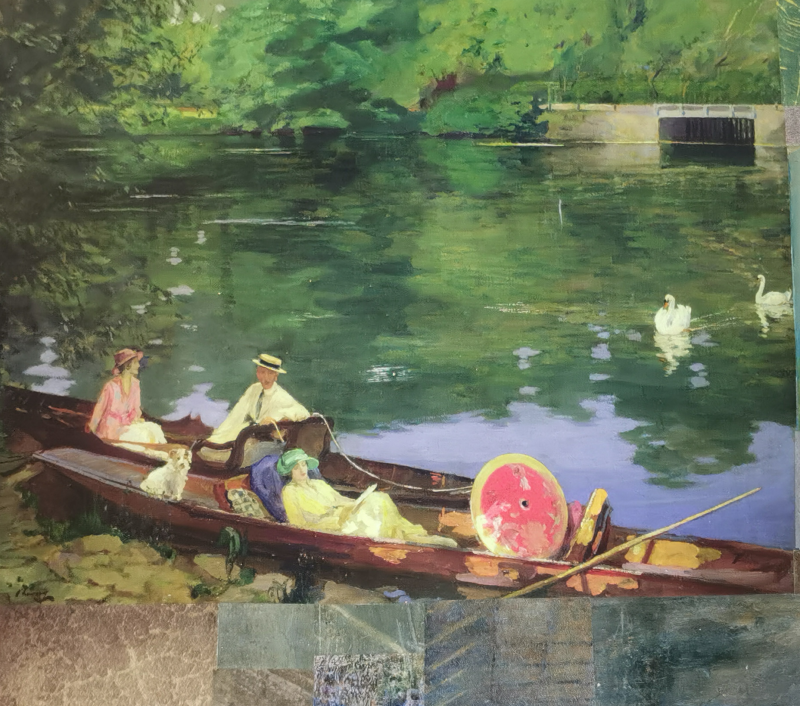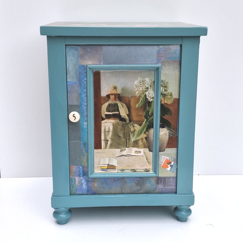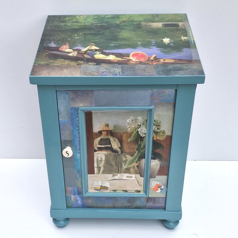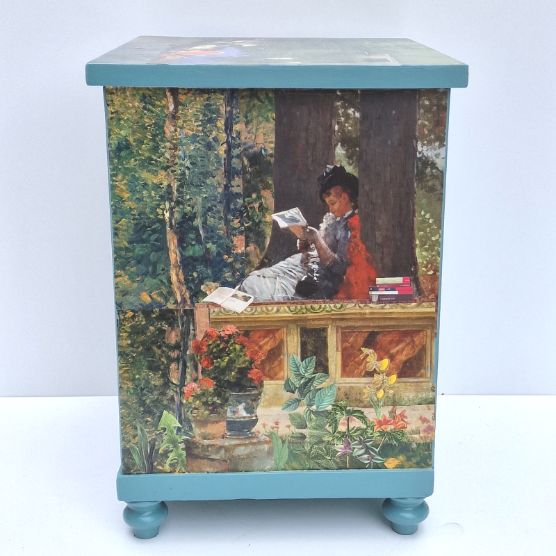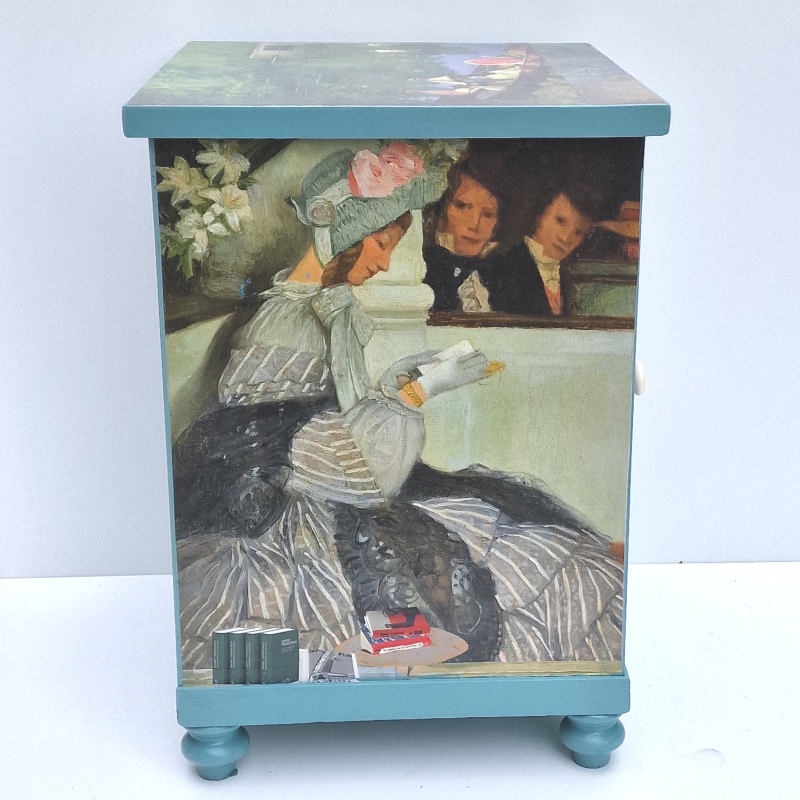 UNIKAT! Kleiner Nachtschrank mit einer Tür, einem, Porzellanknauf und gedrechselten Beinen. Impressionistische Gemälde mit lesenden Frauen bilden die Basis der Gestaltung. Blumen- und Abbildungen von Büchern vervollständigen die vier Bildflächen. VERSAND MÖGLICH.
