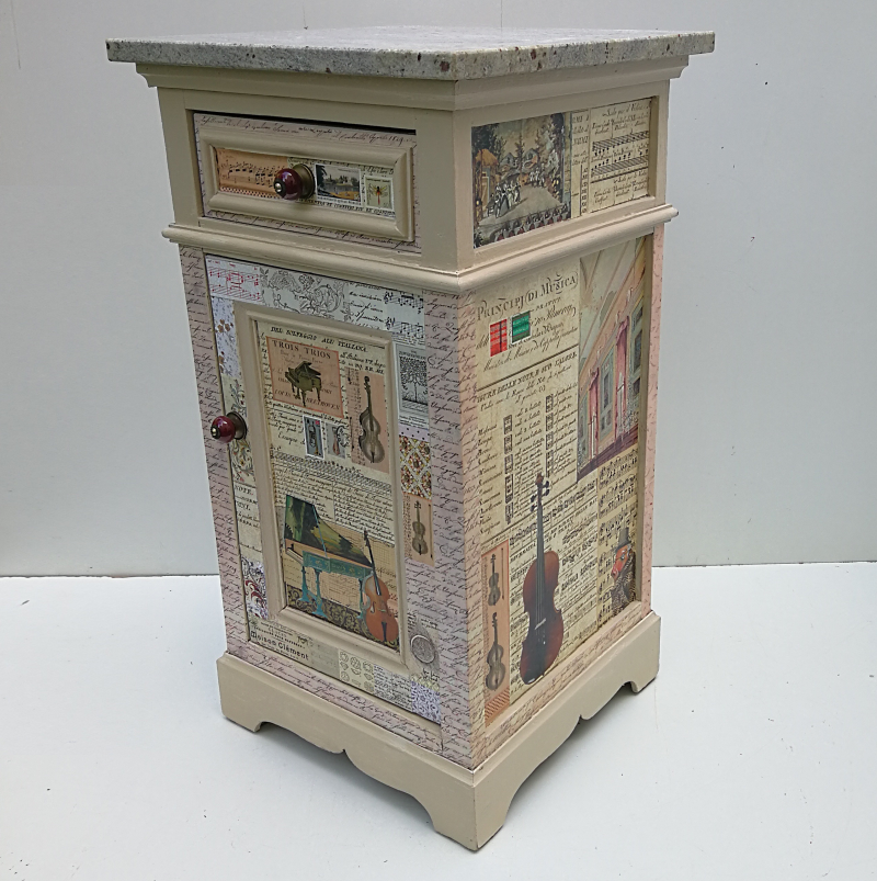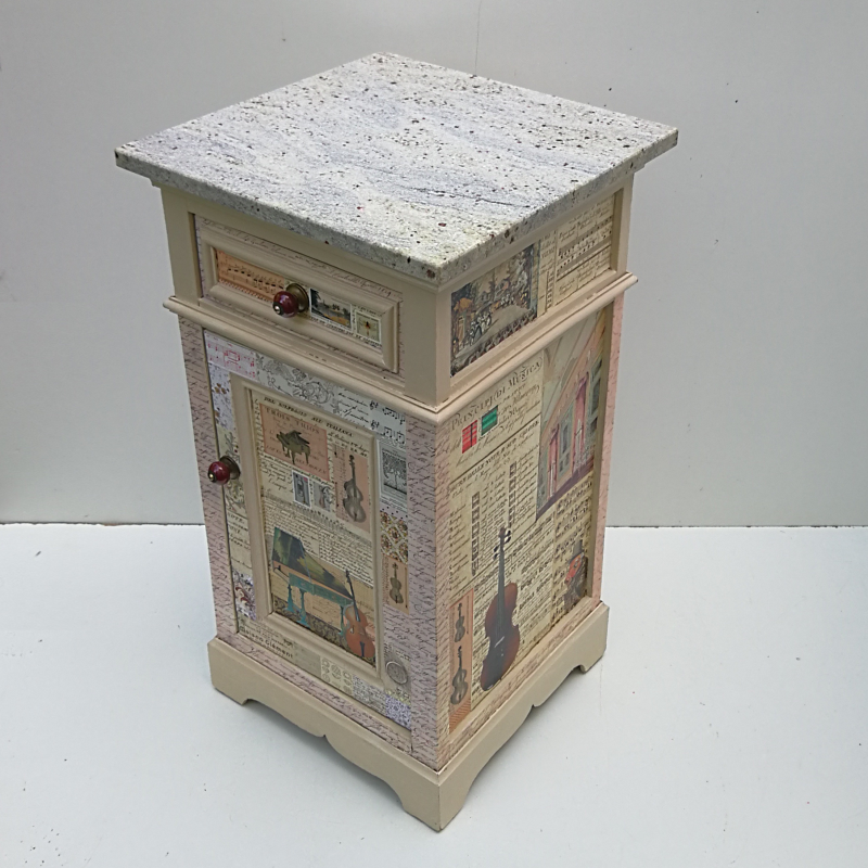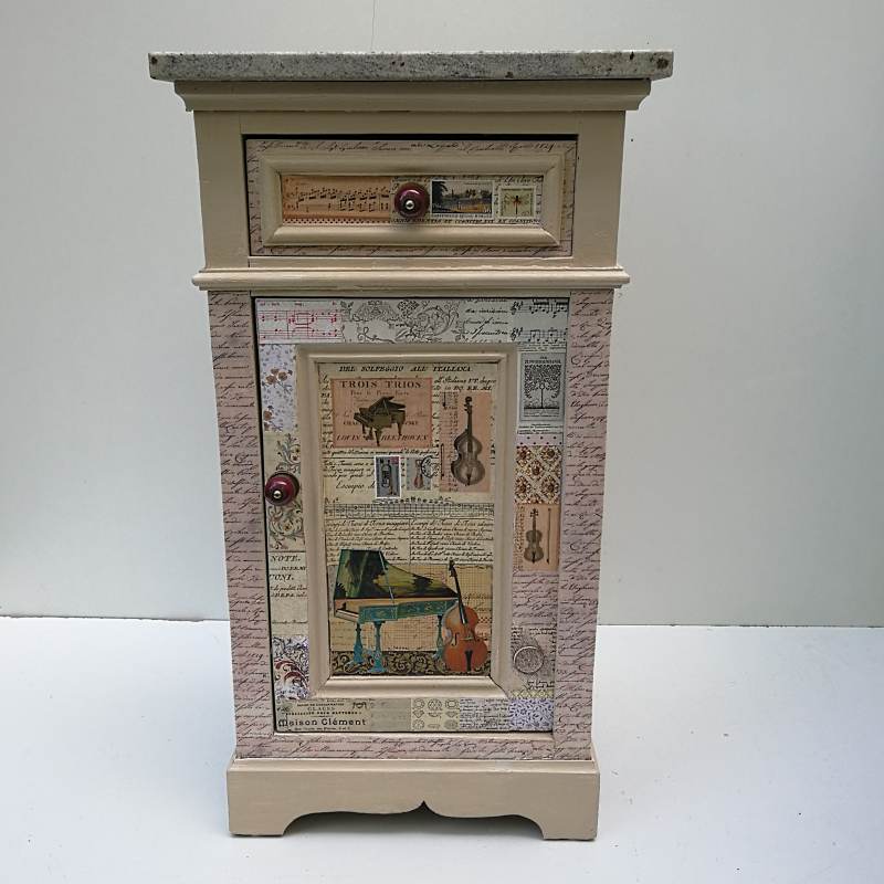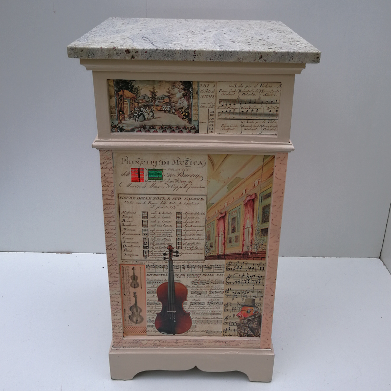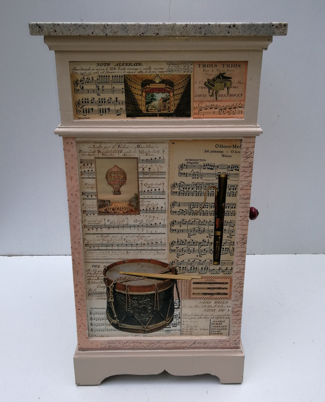 UNIKAT! Hohe Kommode mit Steinplatte, einer Schublade, einer Tür und Porzellangriffen. Die Gestaltung beruht auf einer Kombination aus Noten, Notenpapieren, Ausschnitten aus einem Geschenkpapier, Bühnenbildern zu Opern, Briefmarken zu Musikthemen und Instrumenten. KEIN VERSAND. Bitte nachfragen, ob eine Anlieferung innerhalb Deutschlands möglich ist.
