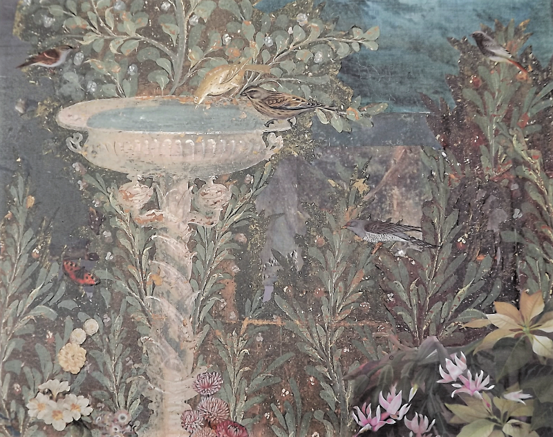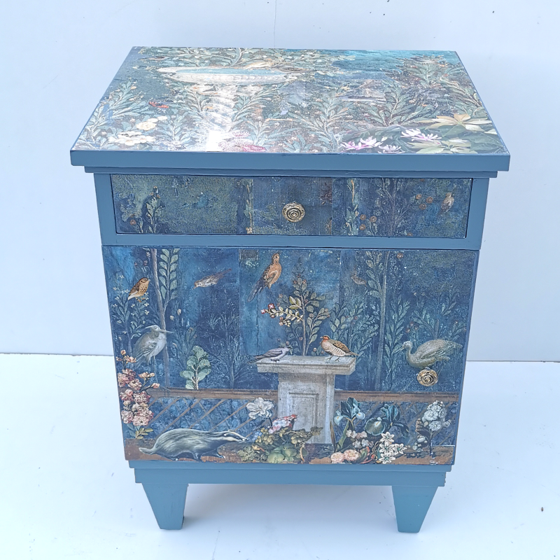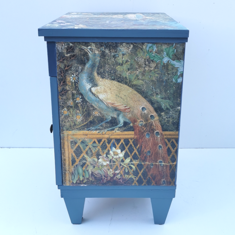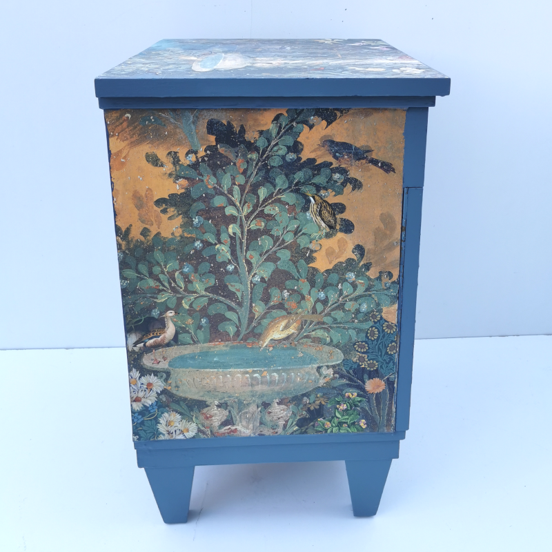 UNIKAT! Hohe Kommode mit einer Schublade, einer Tür und alten Messinggriffen. Als Hintergrund der dunklen Gestaltung wurden Ausschnitte aus römischen Fresken gewählt und mit Pflanzenabbildungen kombiniert. Zahlreiche Tiere halten sich in diesem Garten mit zwei römischen Brunnen auf. Ein neugieriger Dachs hat sich hierhin verirrt und sitzt vor einem Zaun auf der Tür des Möbelstücks. VERSAND MÖGLICH.