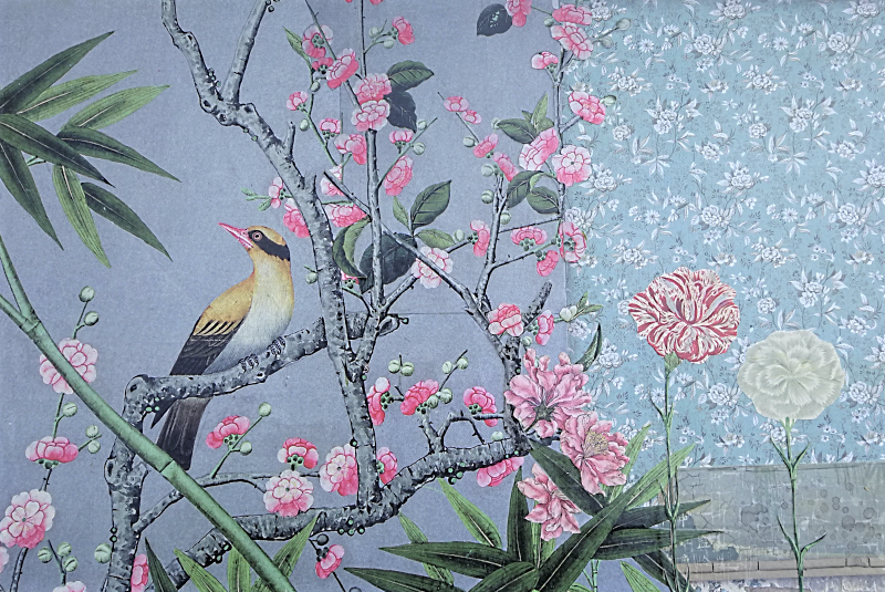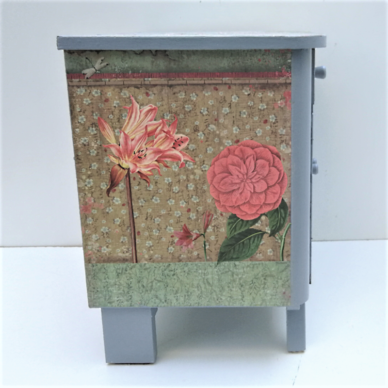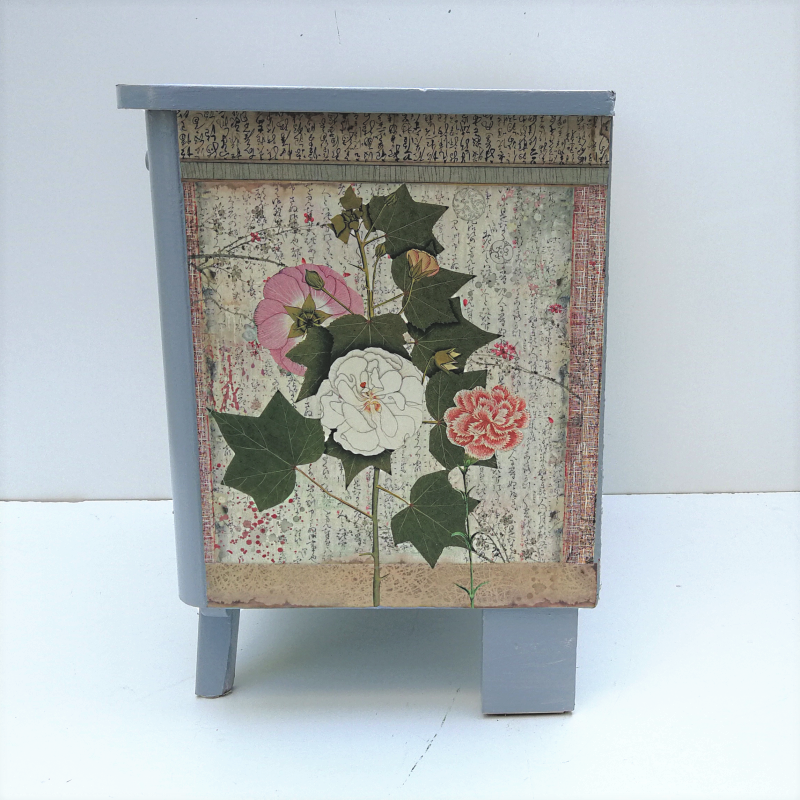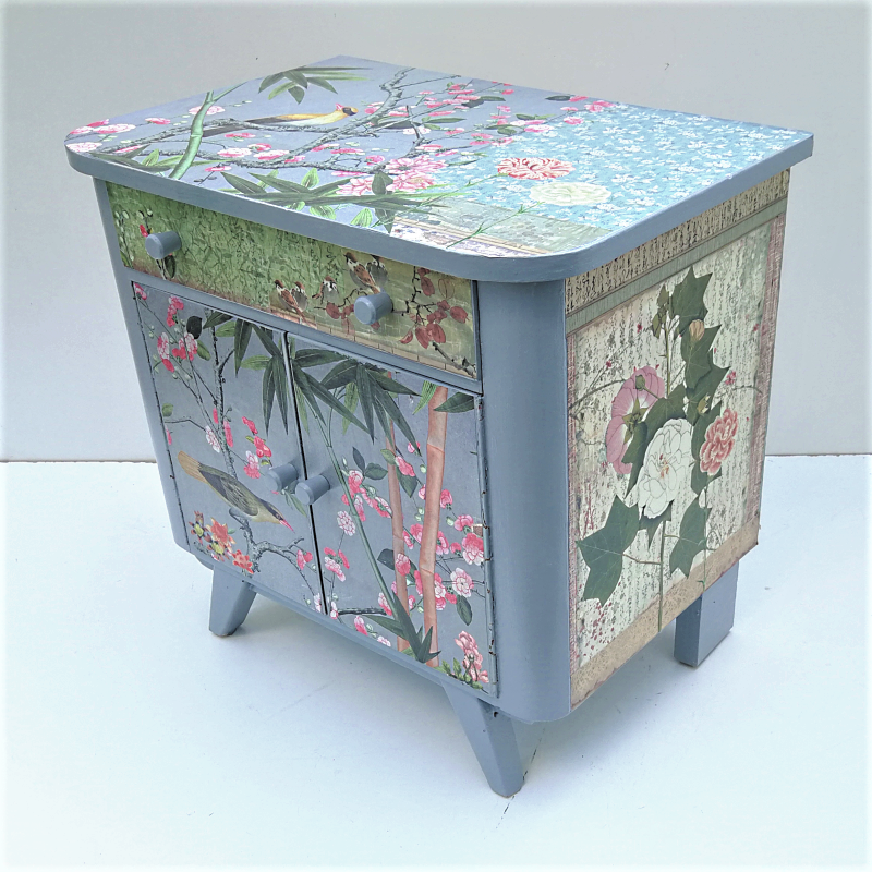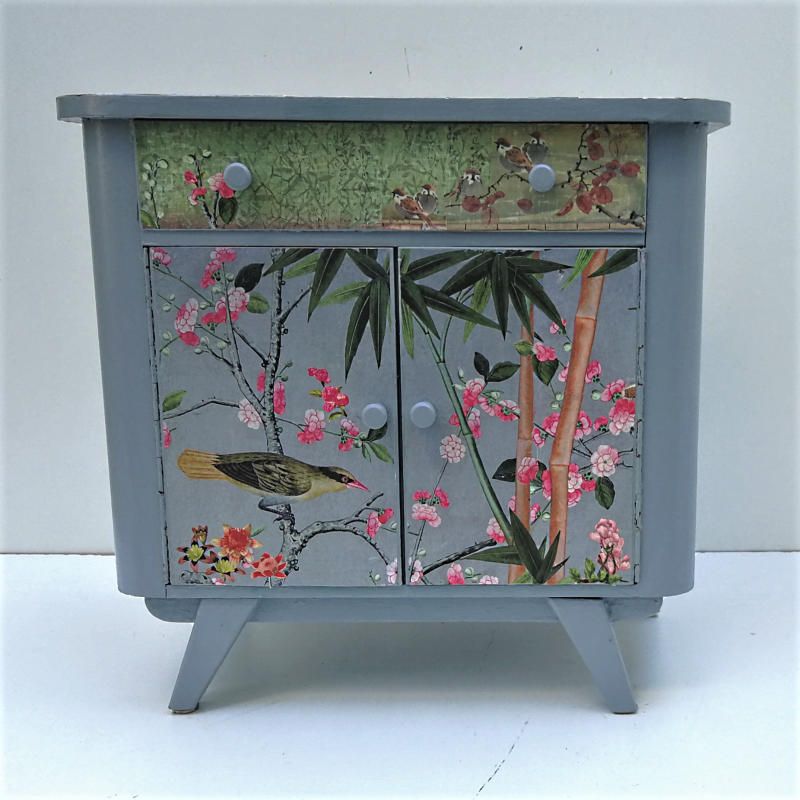 UNIKAT! Niedrige Kommode mit einer Schublade, zwei Türen, ausgestellten Beinen und Holzgriffen. Auf dem kleinen Möbelstück findet ein Ausschnitt einer grauen Tapete mit Pirolen und Kirschzweigen Verwendung. Einige japanisch anmutende Musterpapiere vervollständigen die Gestaltung, auf ihnen blühen Stockrosen, Dahlien und andere Pflanzen. Das Möbelstück ist auch für das Kinderzimmer geeignet. VERSAND MÖGLICH.