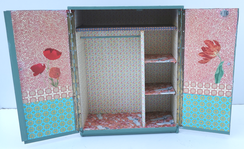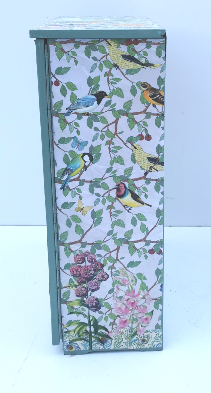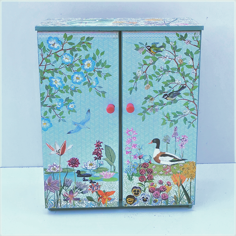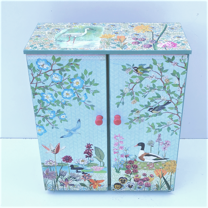 UNIKAT! Puppenschrank mit roten Holzgriffen und einer Gestaltung rund um ein Geschenkpapier mit Bäumen und Vögeln. Auf den Türen sind aus Details aus dem eine Geschenkpapier Bäume gestaltet worden. Darunter sitzen in einer Landschaft mit Weiher Enten; eine Möwe fliegt über den Weiher. Die Seiten sind mit dem Geschenkpapier bezogen, auf den Zweigen der Bäume sitzen Vögel. Zu diesem Puppenschrank passt farblich die kleine Puppenwiege "Vögel" (Einzelpreis: 35,-€) Komplettpreis für Schrank und Wiege: 150,- €. VERSAND MÖGLICH.