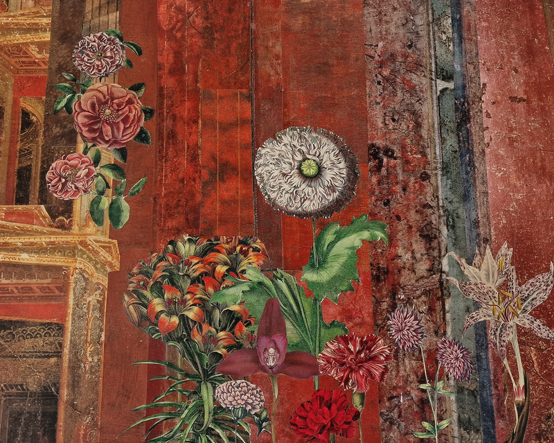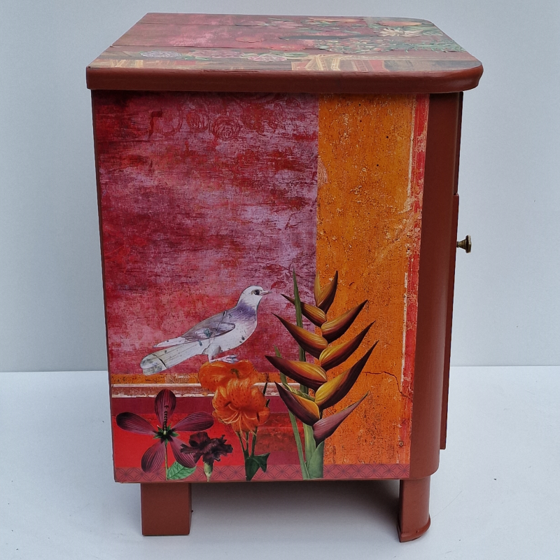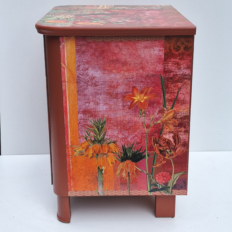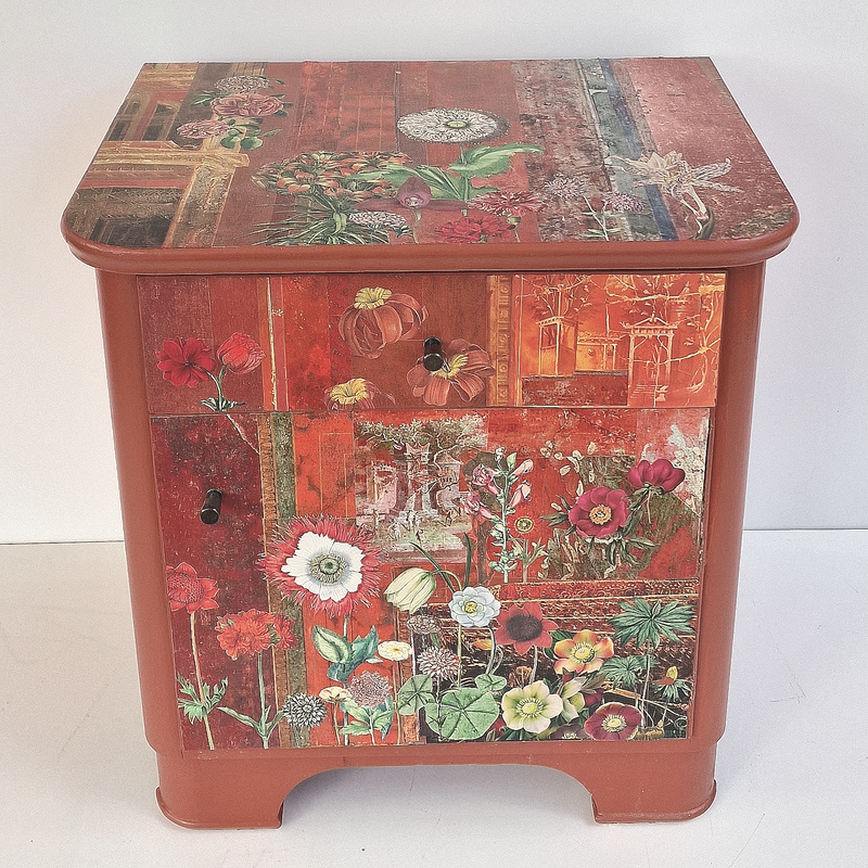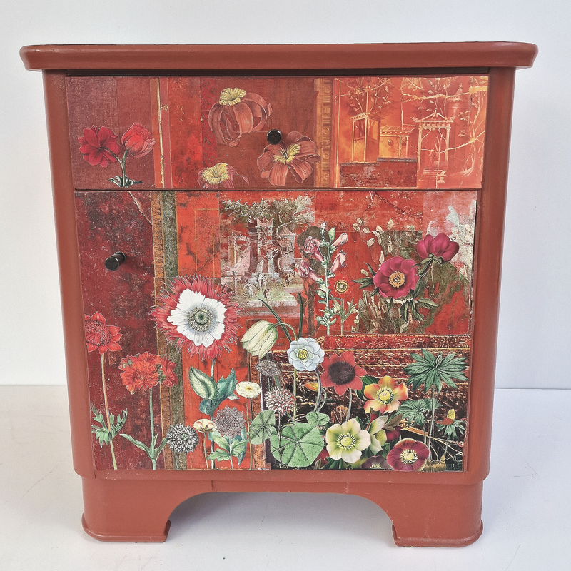 UNIKAT! Niedrige Kommode mit einer Schublade, einer Tür und Messinggriffen. Alle Flächen sind mit Ausschnitten aus roten römischen Fresken gestaltet. Hierauf blühen Frühlingsblumen vor einem Zaun und einem angedeuteten römischen Haus. Auf den Seitenflächen sitzen Vögel in Blumenbeeten. VERSAND MÖGLICH.