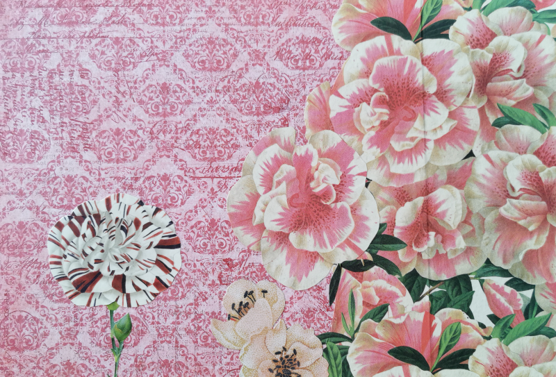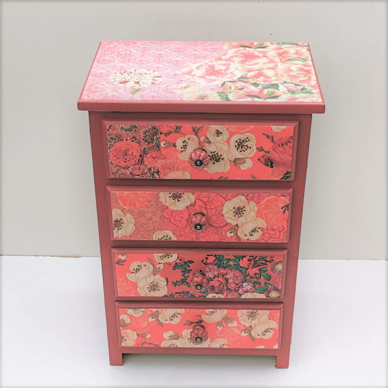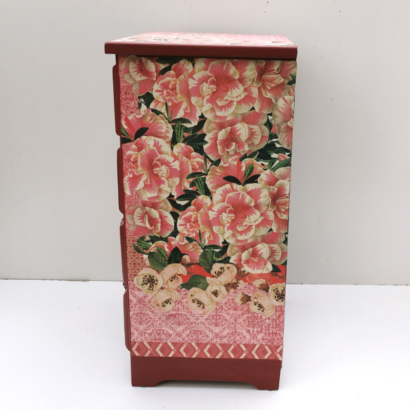 UNIKAT! Kleine Kommode mit vier Schubladen mit roten Porzellangriffen, gestaltet mit roten Musterpapieren und weißen Hibiskusblüten auf der Front und Deckplatte. Seitlich wurde ein Buntpapier mit Magnolienblüten angebracht. Die Kommode eignet sich auch für ein Kinderzimmer. VERSAND MÖGLICH.