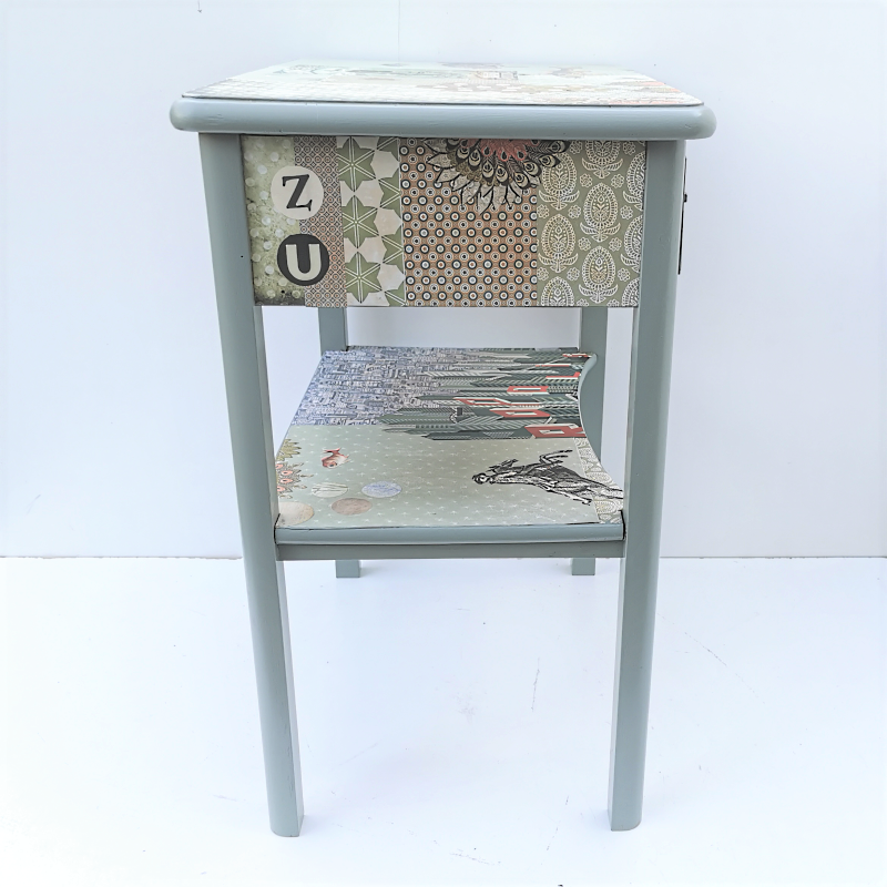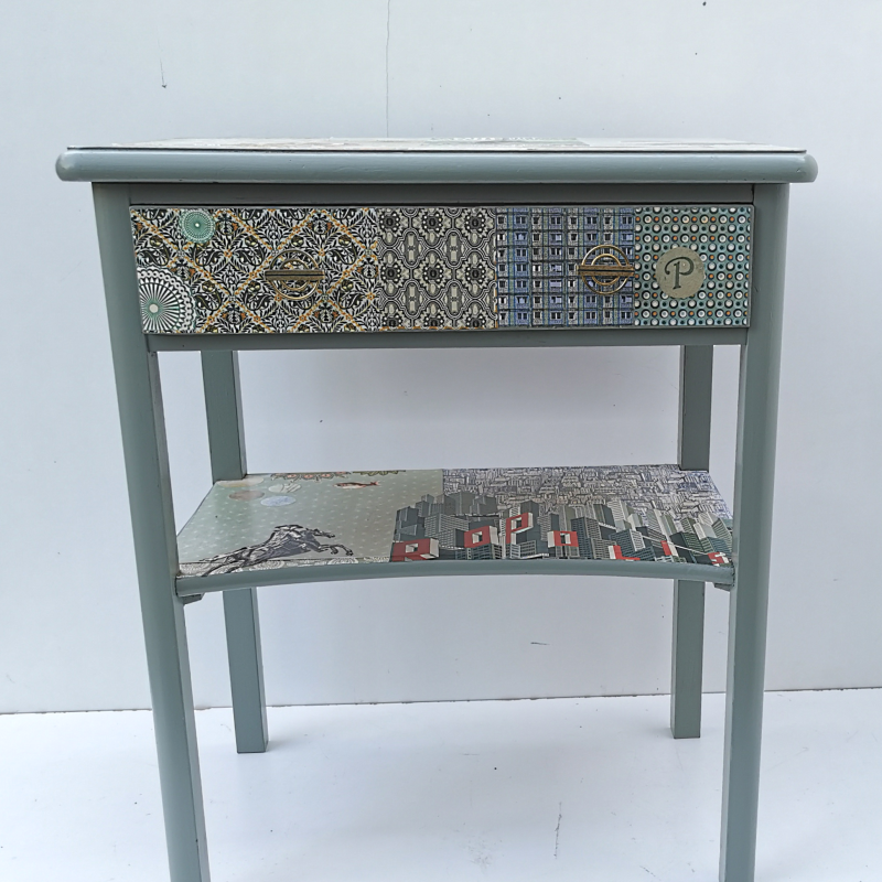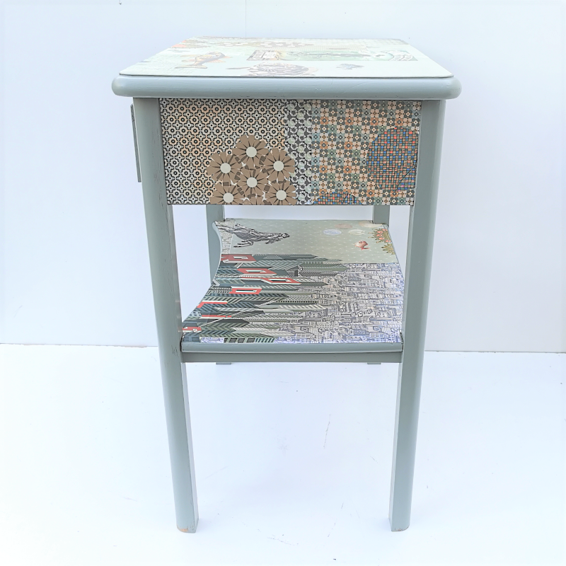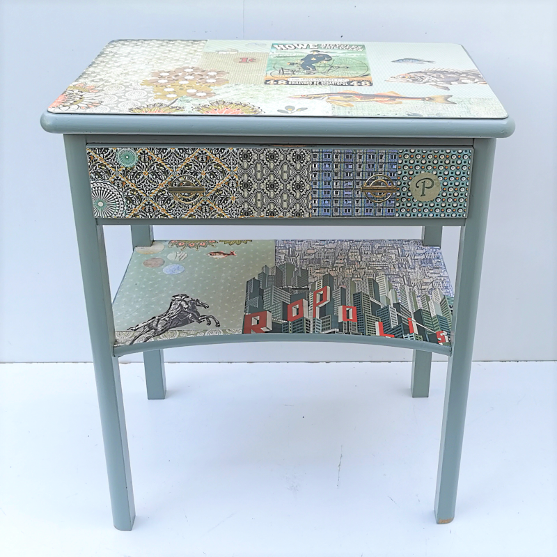 UNIKAT! Schubladentisch mit einem Zwischenbrett, einer Schublade mit Unterteilungen und Originalgriffen. Die Gestaltung besteht aus grafischen Musterpapieren in Grüntönen, Farbkreisen und auf dem Zwischenbrett einem Ausschnitt aus dem Filmplakat für den Film "Metropolis" vor einer stilisierten Großstadt. Auf der Deckplatte schwimmen zwei Fische unter einem Werbeplakat der 20er Jahre. KEIN VERSAND. Bitte nachfragen, ob eine Anlieferung innerhalb Deutschlands möglich ist.