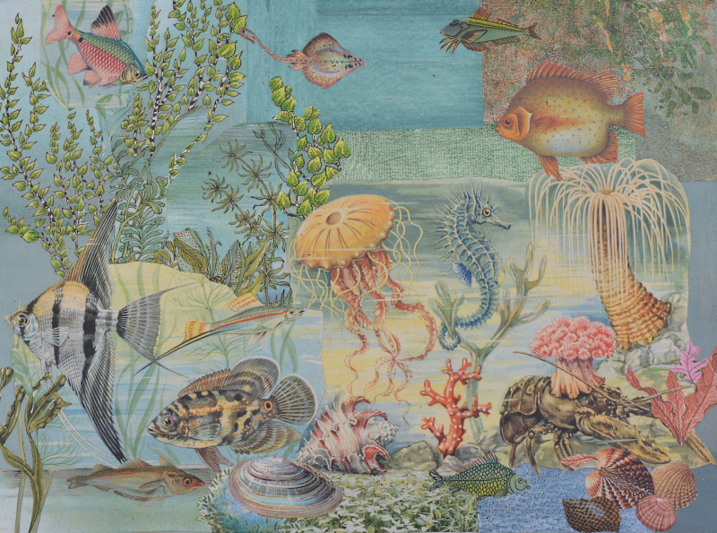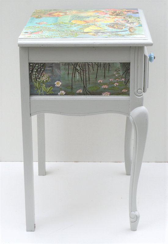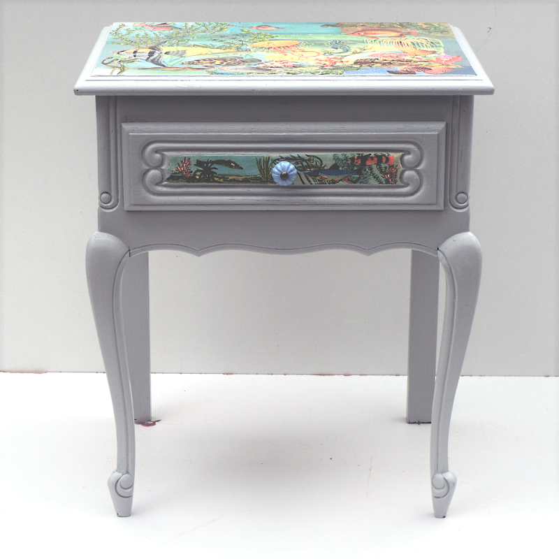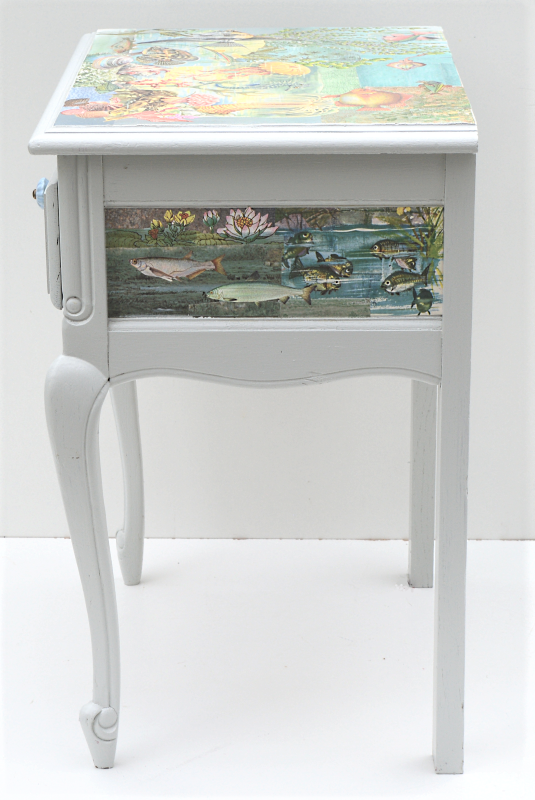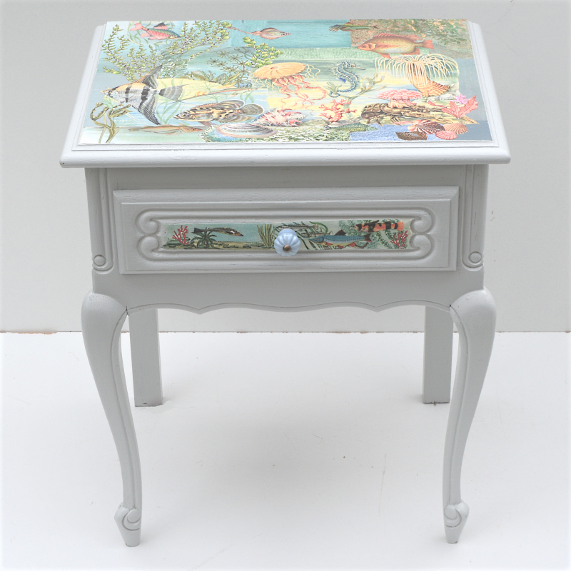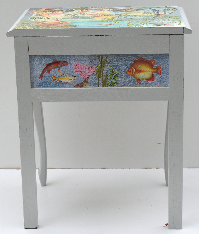 UNIKAT! Niedriges Tischchen mit geschwungenen Beinen und einer Schublade mit Porzellanknopf. Die Deckplatte, alle Seitenbereiche und die Schubladenmitte sind gestaltet mit Ausschnitten aus einem alten DDR Kinderbuch über Meerestiere, Ausschnitte aus anderen alten Kinderbüchern und Geschenkpapieren. Das Möbelstück eignet sich auch als Kindernachttisch. VERSAND MÖGLICH.