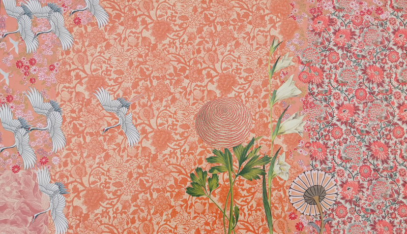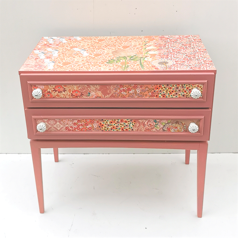 UNIKAT! Niedrige Kommode auf hohen Beinen mit zwei Schubladen und Porzellangriffen. Auf der Deckplatte fliegen Kraniche über italienisches Buntpapier. Alle übrigen Flächen sind mit japanischem und italienischem Papier gestaltet. Auf diesem Hintergrund blühen vereinzelt Blumen.
